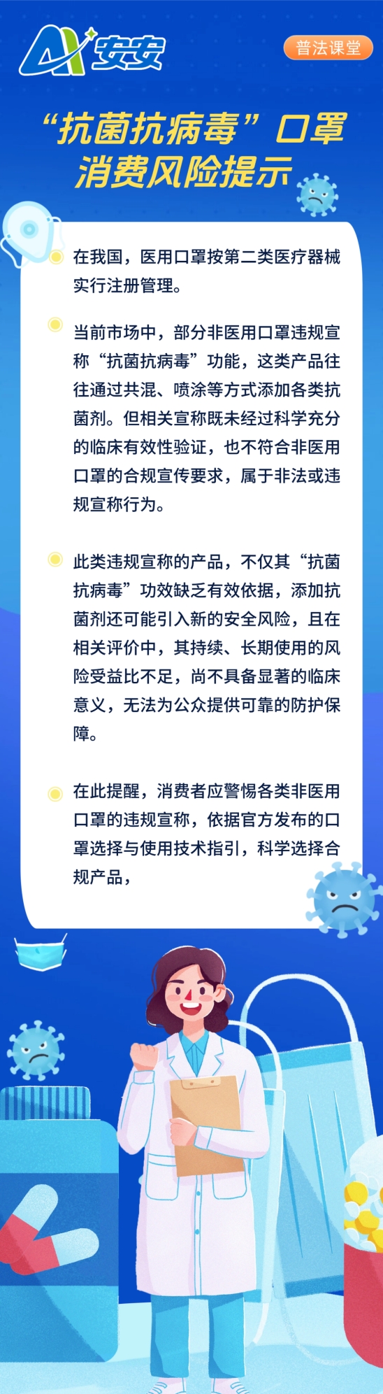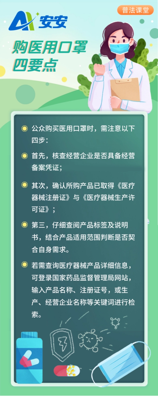 目前,我国常见的医用口罩主要分为三类:医用防护口罩、医用外科口罩以及一次性使用医用口罩,均属于第二类医疗器械范畴。生产医用口罩必须取得省级药品监管部门审批核发的《医疗器械注册证》和《医疗器械生产许可证》;经营医用口罩则需取得市级市场监管部门或行政审批部门核发的备案凭证,省级药品监管部门负责医用口罩生产环节的质量安全监管,市县级市场监管部门负责医用口罩经营使用环节的质量安全监管。