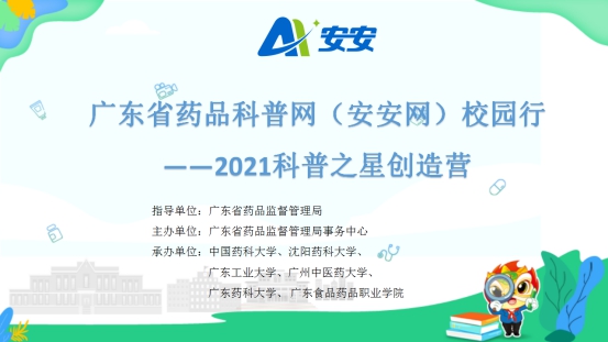 举行“广东省药品科普网(安安网)校园行——2021科普之星创造营总结大会”,邀请指导单位、主办单位、支持单位领导、获奖人员和高校师生等参加,为获奖者颁奖等环节。