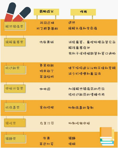 由于感冒症状复杂并且多种多样,目前尚无一种药物能解决多种问题,因此常见的抗感冒药通常由以下若干种药理作用不同的药物成分组方搭配。