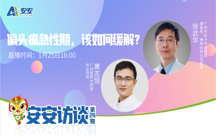 头痛有分类吗?偏头痛的缓解方法有哪些?在急性期如何安全用药呢?近期,安安网将邀请到广州市红十字会医院康复科、神经内科主任徐武华、广州医药大药房执业药师黄志恒做客安安网直播间,为我们破解偏头痛这根“紧箍咒”!