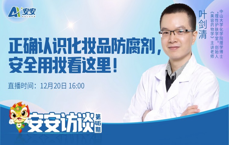 12月20日下午16:00,在安安网直播间,叶剑清跟大家聊聊《正确认识化妆品防腐剂,安全用妆看这里!》,我们不见不散~