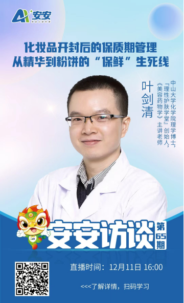 美丽需呵护,安全是底线!如果您对化妆品开封后保质期分不清,或是因为保存不当、误用过期产品引发皮肤问题而烦恼,12月11日下午4点,锁定本期安安访谈直播间,我们与叶老师一起学习化妆品“保鲜”技巧,科学用妆,安心变美!