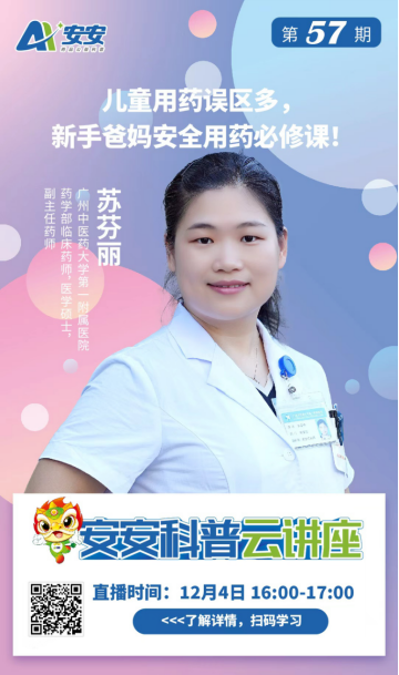 为帮助新手爸妈建立科学、系统的儿童用药认知,避免用药误区,本期安安科普云讲座特别邀请广州中医药大学第一附属医院药学部副主任药师 苏芬丽,通过真实案例、专业知识与生活经验,讲解儿童用药的基本原则与常见误区,并提供实用操作建议,让家长在孩子生病时能科学用药,守护孩子健康成长。