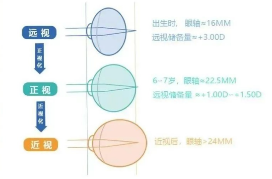 由于幼儿眼球尚未完全发育,眼轴(前后轴)相对较短,这是一种天然远视状态。随着年龄增长,眼轴逐渐变长,远视储备不断消耗,在12岁左右眼球发育成为一个正球形,光线进入眼睛后会刚好聚焦在视网膜上,此时既没有远视也没有近视,视力最为清晰。