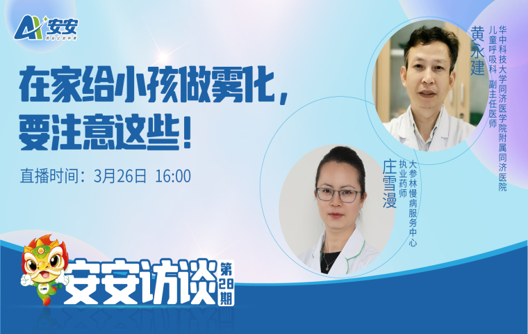 为避免家长在治疗过程中的不规范,近期,安安网将邀请到华中科技大学同济医学院附属同济医院儿科副主任医师黄永建、大参林慢病服务中心执业药师庄雪漫做客安安网直播间,为我们解读儿童雾化的常见药等相关科普知识。