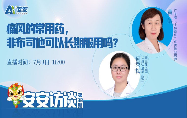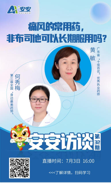 近期,安安网直播间将邀请到第三届全国“身边最美药师”何秀梅、广东省“十佳百优”优秀执业药师黄敏为我们科普下关于痛风药物的相关知识。