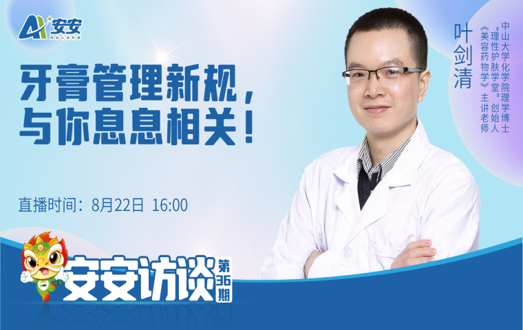 8月22日下午16:00-17:00,在安安网直播间,叶剑清老师跟大家聊聊《牙膏管理新规,与你息息相关!》,我们不见不散~