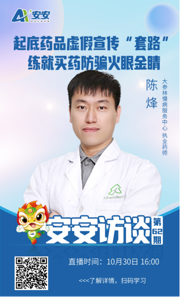 想知道那些“根治顽疾”“速效神药”背后的猫腻吗?想学会辨别药品真假宣传的实用技巧吗?10月30日请锁定安安网直播间,为您揭露药品虚假宣传套路,助您练就防骗火眼金睛。