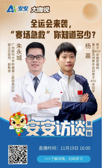 为了提高大众对赛场急救的认知,本期安安访谈特别策划大咖说节目,特邀广州医科大学附属第二医院副主任医师、副教授 朱永城和男子400米国家健将、第三届亚洲青年运动男子400米冠军 杨嘉参与互动访谈。本期节目中,两位嘉宾将围绕大型赛事活动中医疗保障服务中的核心要点,详细解读赛场急救的专业知识,科普急救药品与医疗器械的正确使用方法,进一步提高公众安全运动、科学救急的意识和能力,共同为这场精彩圆满的体育盛会保驾护航。
